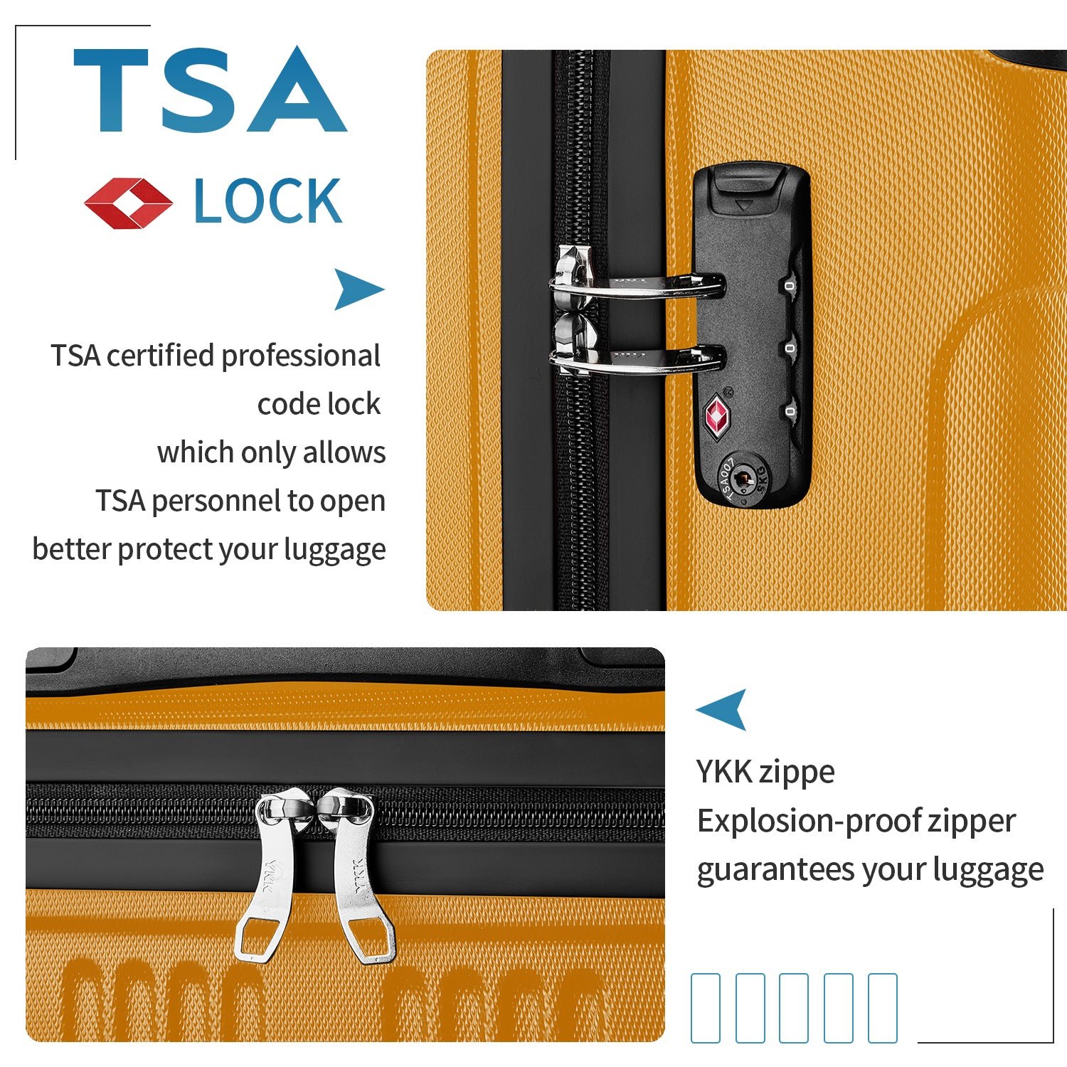 • TSA Luggage Locks: A professional code lock approved by TSA to ensure that your luggage sets clearance will not be damaged during customs inspection. The latest TSA lock allows you to prevent damage to the code lock to the greatest extent during your usual travel. It is for international travel The best choice.